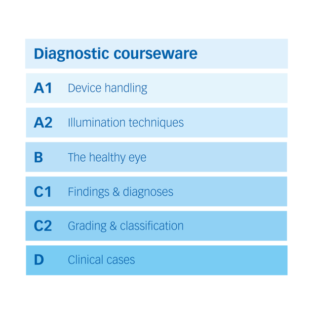 Le programme Eyesi Slit Lamp se compose de quatre niveaux, qui portent sur différents aspects clés des examens avec lampe à fente. Les cours pour débutants permettent aux stagiaires de se familiariser avec les techniques de manipulation et d’éclairage de la lampe à fente. Les cours avancés présentent un éventail d’images cliniques et de systèmes de classification standard. Les stagiaires progressent dans le cursus en suivant successivement les cours d’un niveau.